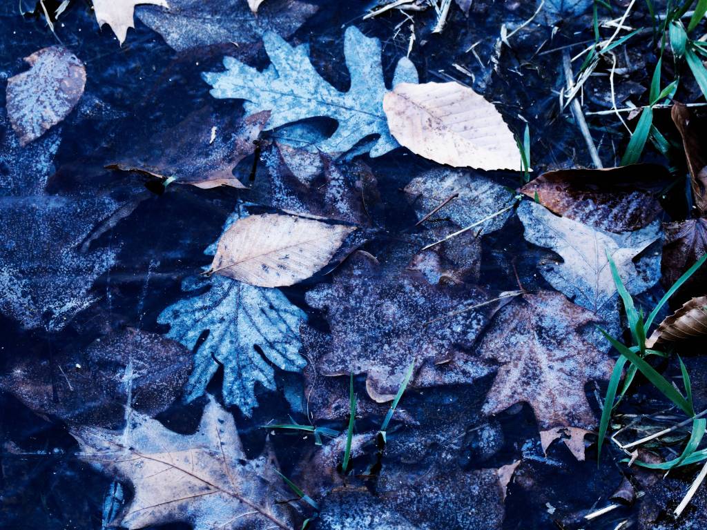 すっかり冬の気配で落ち葉も凍っている。
